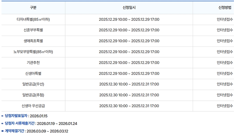 ■ 공급위치 : 행정중심복합도시 5-1생활권 L1블록 ■ 공급대상 : 공공분양주택 643세대 (건설호수 총 681호 중 오피스텔 38호는 추후 별도 공급 예정) ※신청접수 시 신청자격을 검증하지 않고 신청자의 입력(기재)사항만으로 당첨자를 결정하므로 공고문의 공급유형별 신청자격을 사전에 반드시 확인하시기 바랍니다. ■ 모집공고 : 2025.12.19(금) ■ 청약신청접수 - 특별공급 : 2025.12.29(월) 10:00~17:00 - 일반공급 : 2025.12.30(화), 10:00 ~ 31(수), 17:00 ■ 당첨자발표 : 2026.1.15(목), 16:00 이후 ■ 서류제출: 온라인 2026.1.19(월), 10:00 ~ 20(화)16:00 현 장 2026.1.22(목) ~ 24(토), 10:00 ~ 16:00 ■ 계약체결일 : 2026.3.9(월)~12(목) -전자계약 : 2026.3.9(월), 10:00 ~ 3.10(화), 16:00 (부동산거래전자계약시스템) -현장계약 : 2026.3.11(수) ~ 12(목) 10:00~16:00 (주택전시관 1층) ■ 기타 자세한 사항은 모집공고문을 확인하시기 바랍니다.