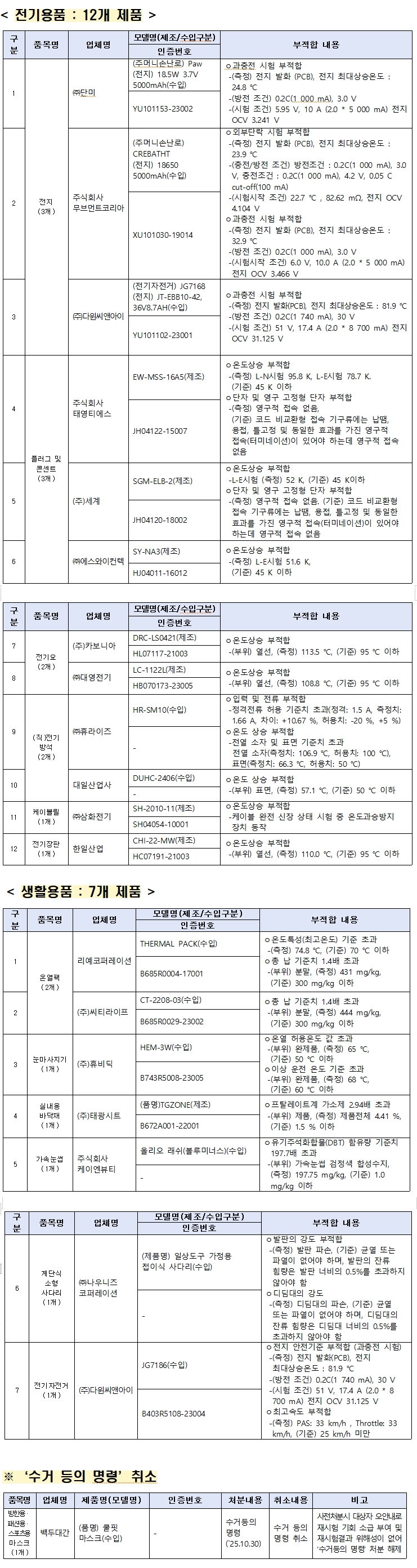 전기용품으로는 과충전으로 화재 위험이 있는 전지(3개), 최고온도 기준치 초과로 화재 위험이 있는 플러그 및 콘센트(3개), 전기요(2개), 전기방석(2개) 등이 있으며, 생활용품으로는 허용온도 기준치를 초과한 온열팩(2개), 눈마사지기(1개) 등이 있다.