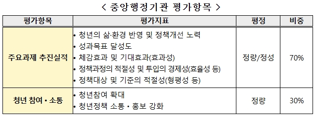 ㅇ 정책의 체감 효과와 목표 달성도를 보는 ‘주요과제 추진실적’이 70%, 청년의 목소리를 얼마나 반영했는지를 보는 ‘청년 참여‧소통’이 30% 비중을 차지한다.