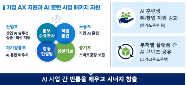 효과적인 노동시장 AI 인재양성을 위해 관련부처와의 협업도 한층 강화한다. 대표적으로 기업 AX 지원 사업(과기정통부, 중기부, 산업부)과 기업 AI 훈련 사업(노동부)을 패키지로 제공한다. 사업 간 홍보, 상호 수요조사 후 희망 기업 지원, 사업 신청 시 가점 등 인센티브 부여, AI 합동 컨설팅(AI 기술 전문가와 훈련 전문가로 ‘원 팀’ 구성) 등 사업 성격에 따라 다양한 방식으로 협업해 기업과 노동자가 AI를 제대로 활용하여 성과를 높일 수 있도록 뒷받침한다. 나아가 AI 훈련 참여자의 취‧창업 연계, 부처별 교육훈련 플랫폼 간 우수 AI 콘텐츠 공유와 같이 시너지를 낼 수 있는 부처 간 협업사업을 지속 발굴할 방침이다.